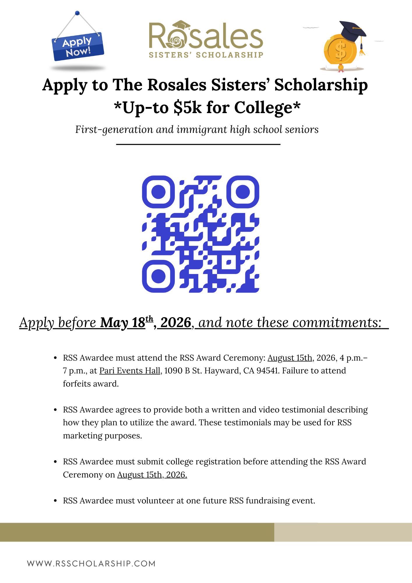 You can sign up for newsletters for updates, or email us at info@rsscholarship.com for inquiries about tax-exempt status, application questions, and organizational policies.