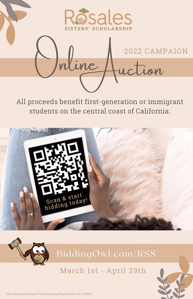 Please join us in this effort. Our goal this year is to fundraise a total of $32,000, doubling what we were able to raise last year. I’m happy to say that we have just hit the $5,400 mark—within our online fundraising goal of $10,000. Our Annual Online Auction is happening now! Go to BiddingOwl.com/RSS and bid on over 30 items, all benefitting first-generation or immigrant students on the central coast of California. Join us!